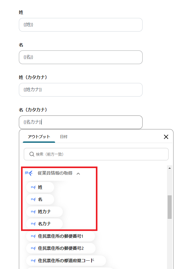 ここでは例として姓、名、姓(カタカナ)、名(カタカナ)などをアウトプットを使用して設定しています。