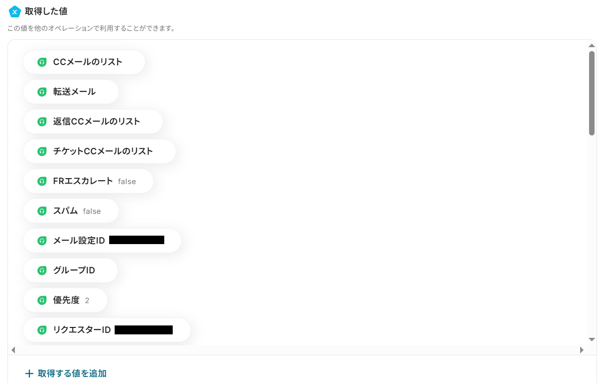 取得した値は以降のアクションで活用可能です。つまり、ここで取得した値をZendeskに自動登録可能となります!→アウトプットについて
