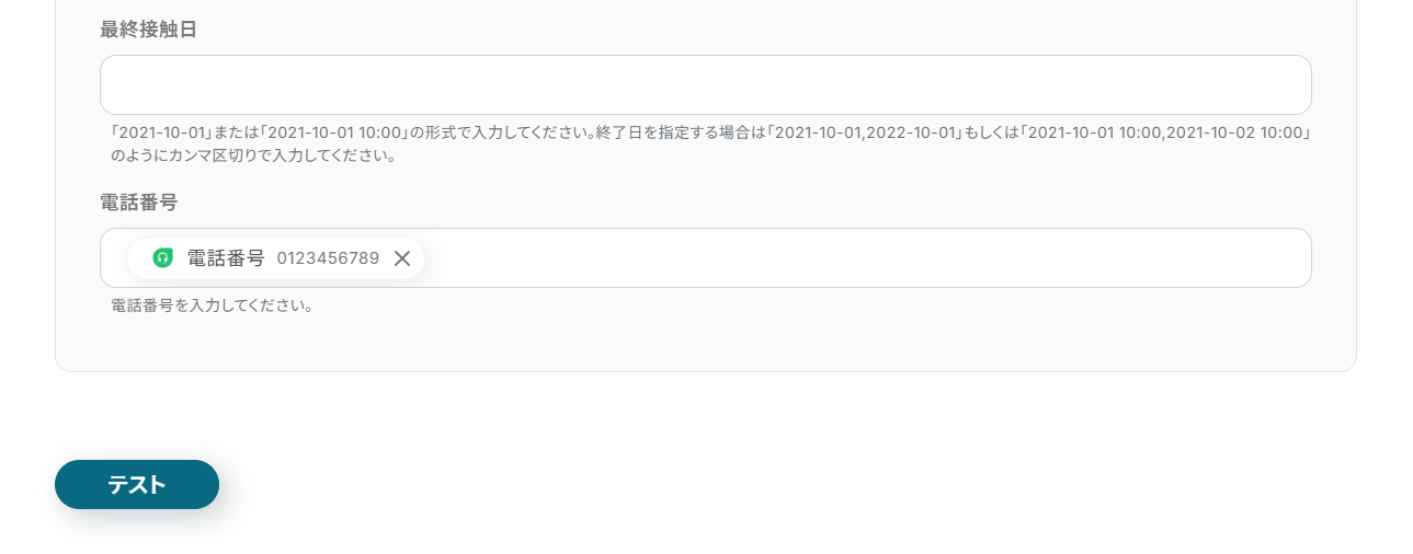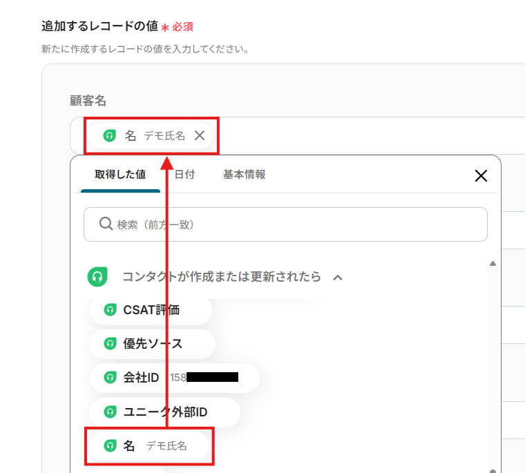 - テストに成功すると、「取得した値」に更新日時が最も新しいコンタクトの情報が追加されます。