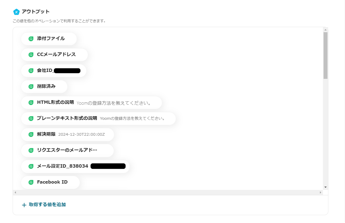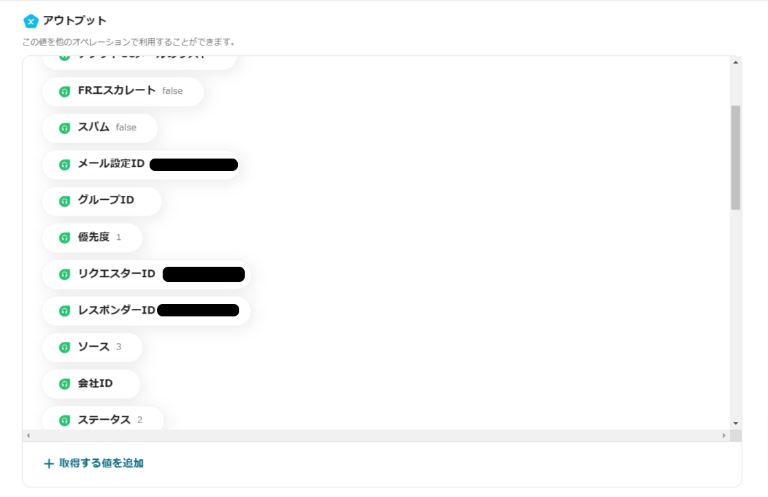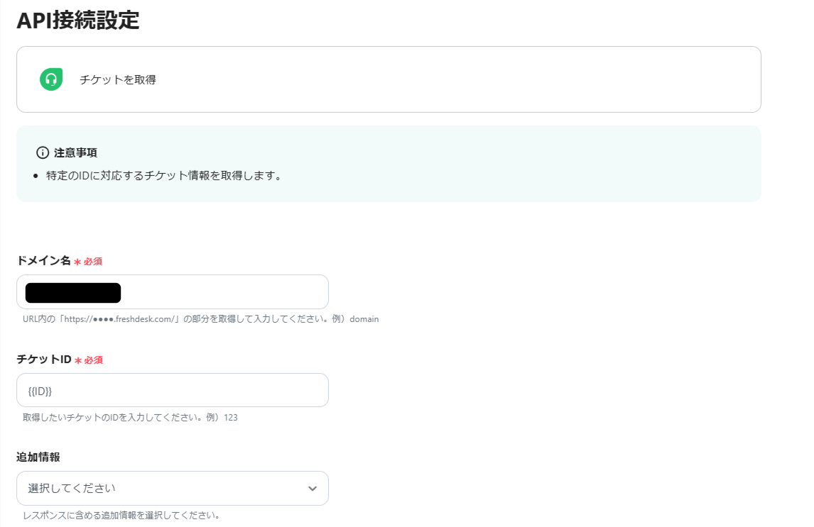 チケットIDの欄にはアウトプットの「ID」が反映されているので、追加情報が必要であればプルダウンから選択して「テスト」をクリックしましょう。