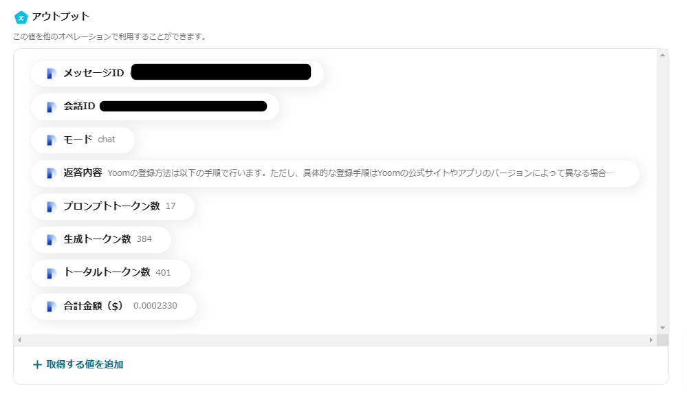 入力をしたら「テスト」をクリックし、成功するとアウトプットが取得されます。