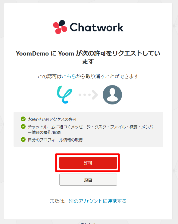 「許可」をクリックして、Chatworkのマイアプリ連携の設定は終了です。