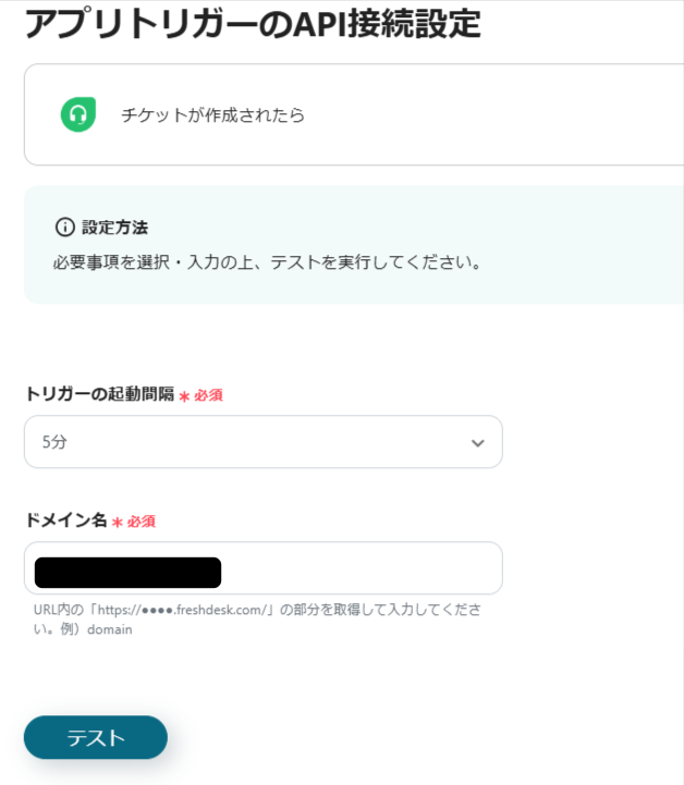 ドメイン名をFreshdeskのURLから取得したらテスト用にチケットを作成し、「テスト」をクリックしてください。