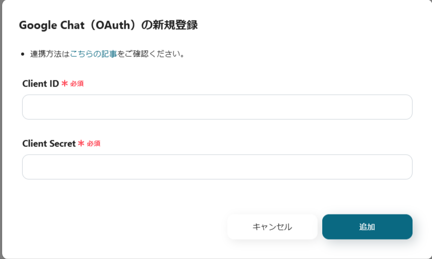 Google chat(OAuth)のマイアプリ連携には、Client IDとClient Secretの入力が必要です。