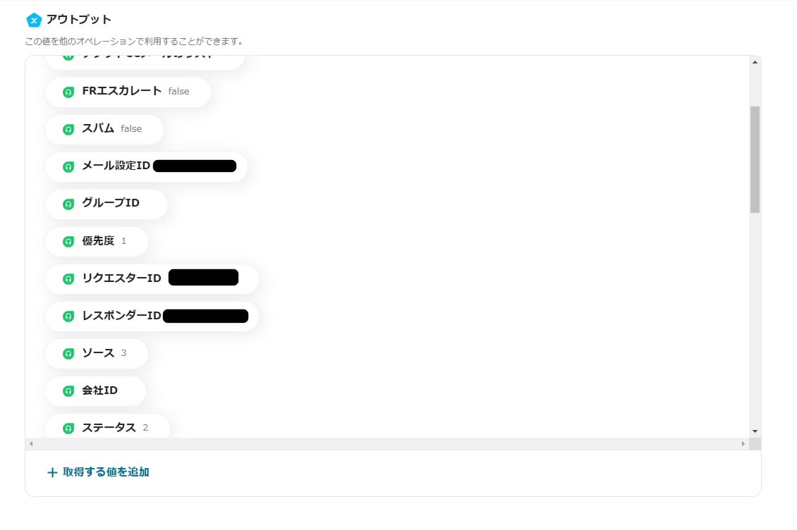 テストが成功すると、生成された返答内容などがアウトプット値として取得できます。