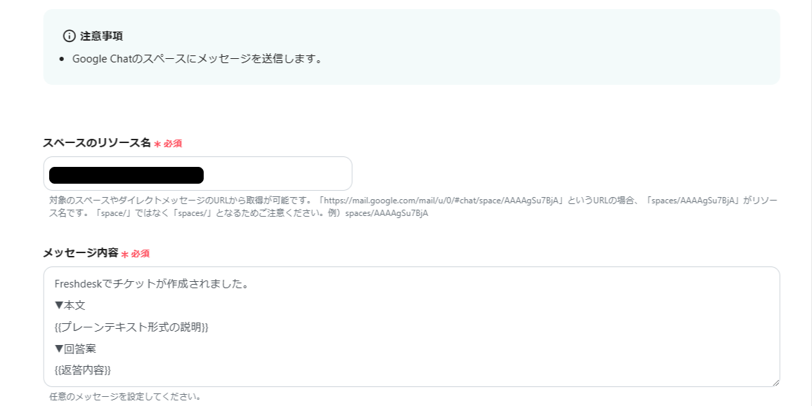 続いて、Google Chatに送信するメッセージの設定を行います。