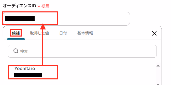 「オーディエンスID」には、候補として表示されるMailchimpのIDを入力しましょう。