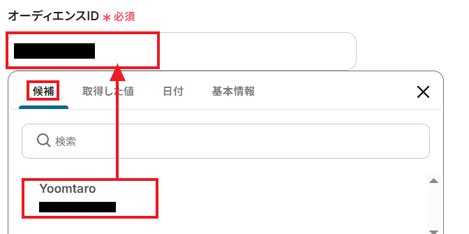 - Mailchimpでコンタクトを追加するアクションを設定する際に、追加先となるオーディエンスIDを任意で設定してください