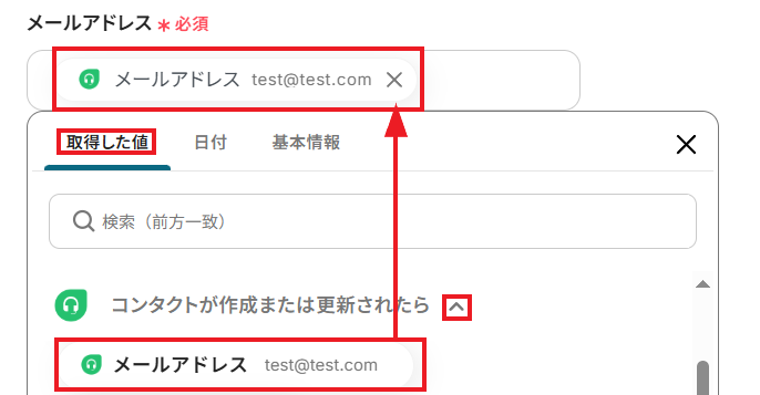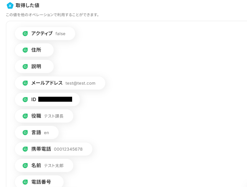「取得した値」として、Freshdeskに作成したコンタクトの情報が反映されていれば成功です!