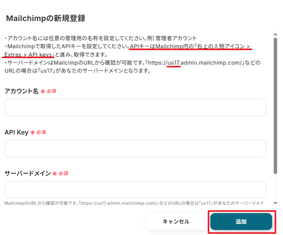 「API Key」と「サーバードメイン」は、それぞれMailchimpにログインした状態で情報を取得し、コピー&ペーストして「追加」ボタンを押してください。
