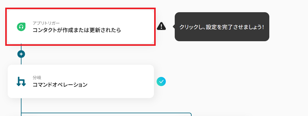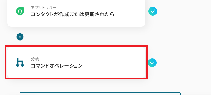 - 次に、オペレーションで分岐機能を設定し、コンタクトの新規作成時に後続の処理を分岐させます