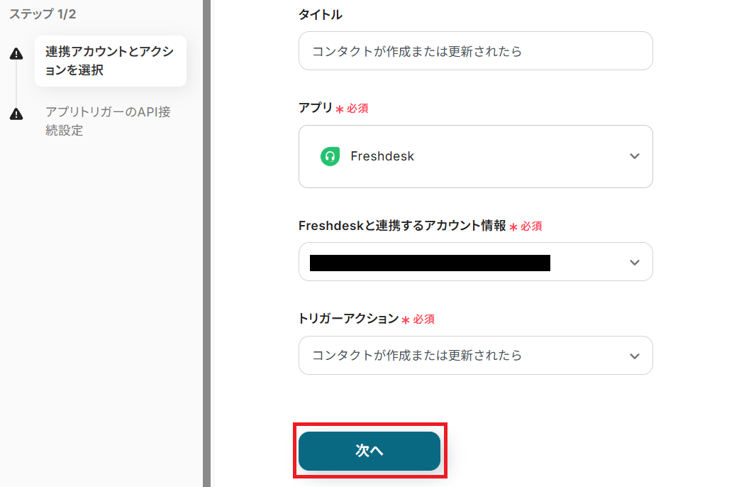 タイトルを任意で設定し、Freshdeskと連携するアカウントやアクション内容を確認したら「次へ」を押してください。