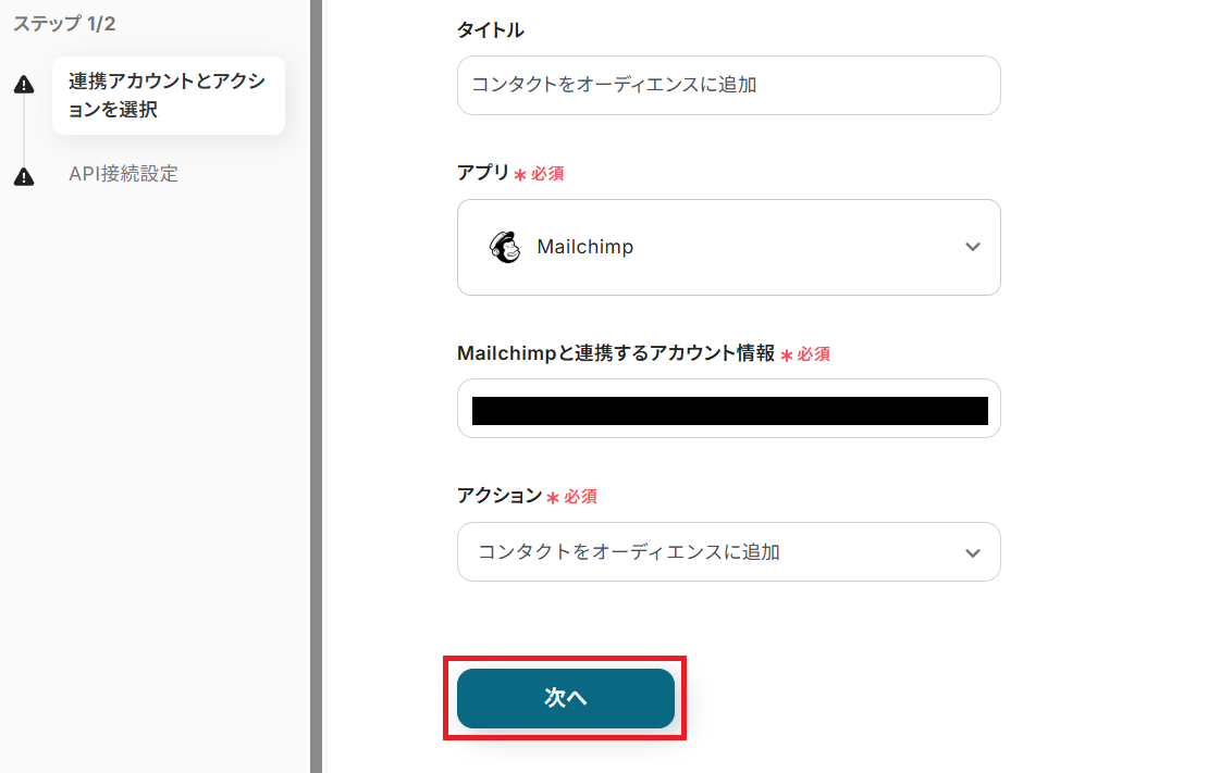- 最後に、オペレーションでMailchimpを選択し、「コンタクトをオーディエンスに追加する」アクションを設定して、対象のコンタクト情報を登録します。