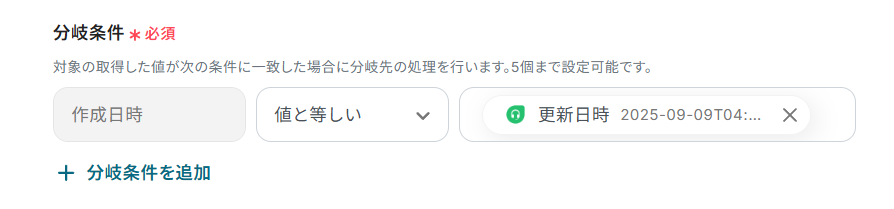 - 次に、オペレーションで分岐機能を設定し、特定の条件に合致する場合のみ後続の処理に進むよう設定します