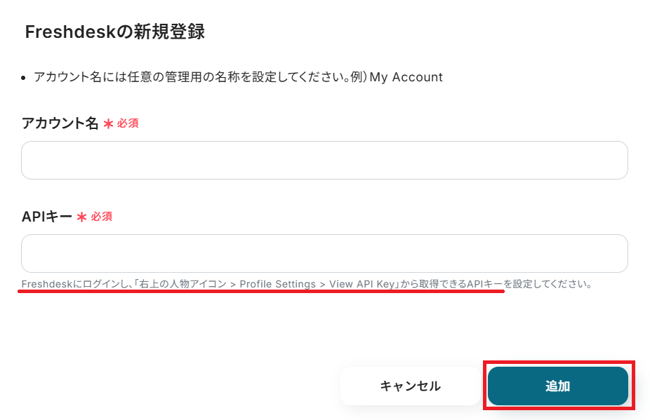 APIキーはFreshdeskにログインした上で取得し、ペーストして「追加」をクリックしましょう。