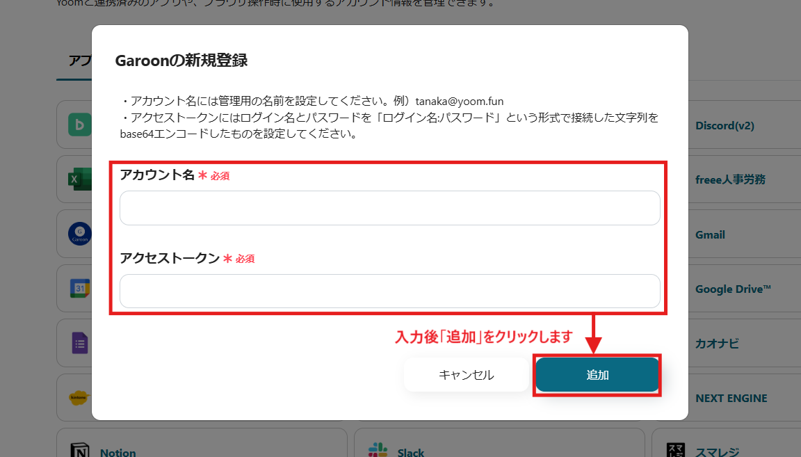 Garoonを選択できたら、アカウント名と事前準備で作成したアクセストークン入力して追加してください。