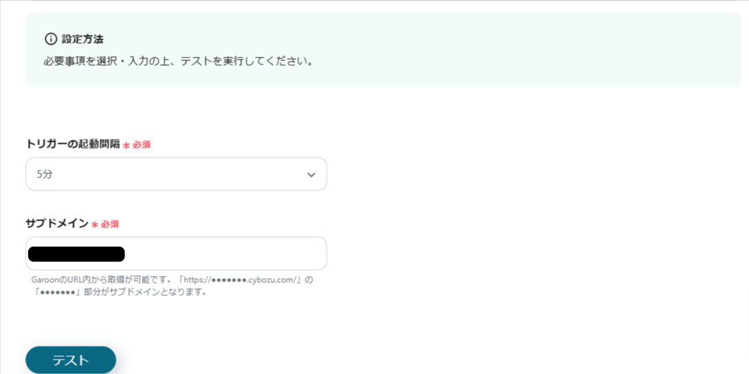 項目を入力したら、Garoonでテスト用にスケジュールを新しく登録してから「テスト」をクリックしてください。