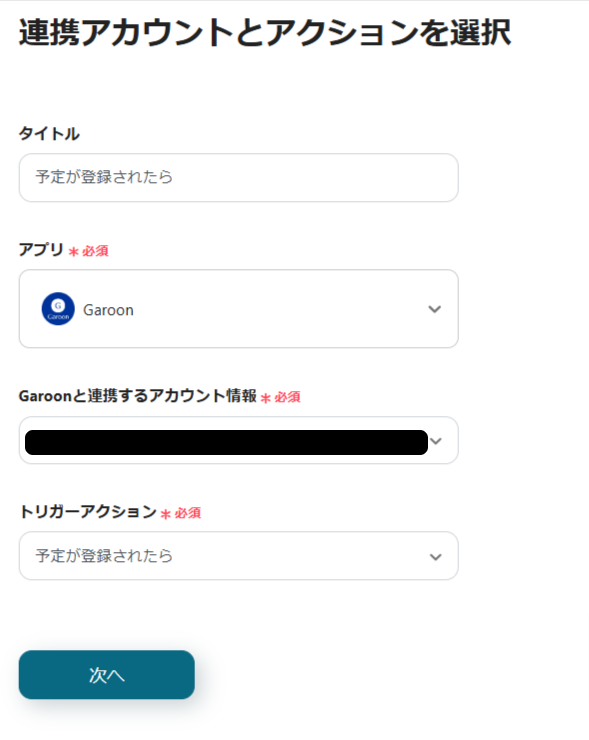 1ページ目では、Garoonと同様に任意でタイトルの修正とアカウント情報の確認をしたら次に進んでください。