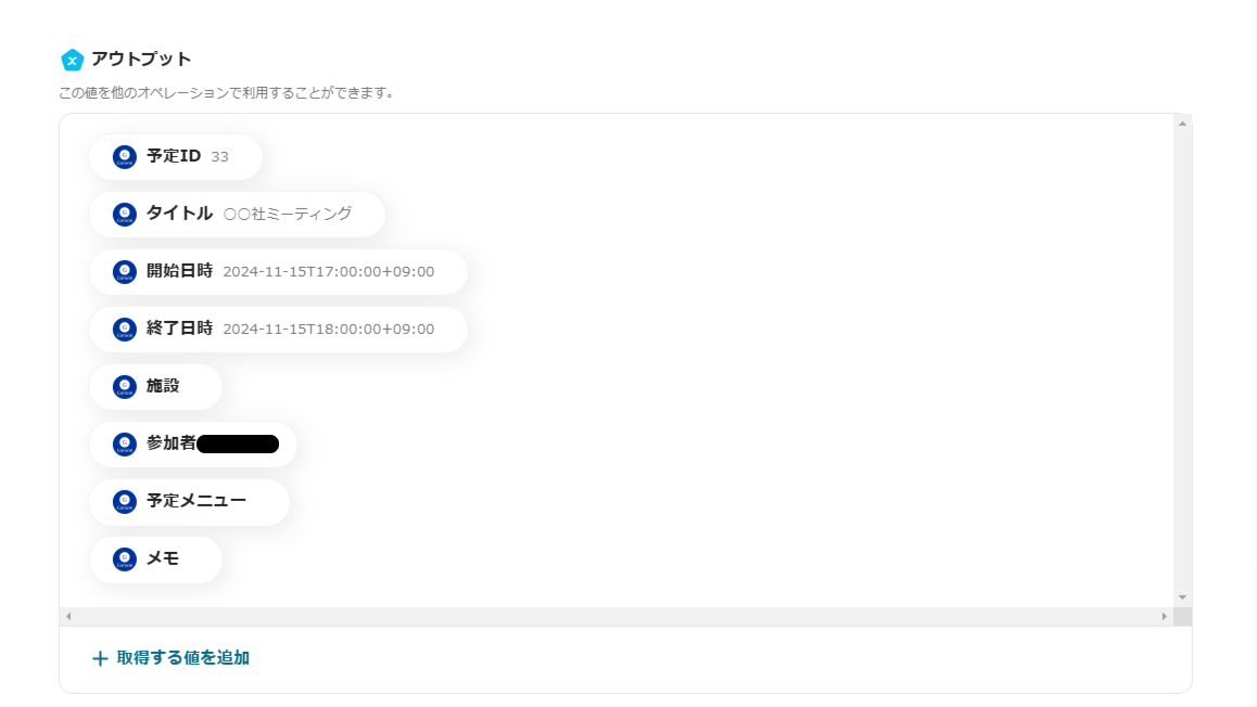アウトプットを反映させた項目は、Garoonで登録したスケジュールの内容に応じて変化します。
