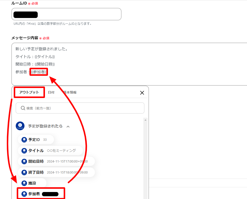 ルームIDは候補から選択し、メッセージ内容はGaroonの設定で取得したアウトプットを活用してしてください。
