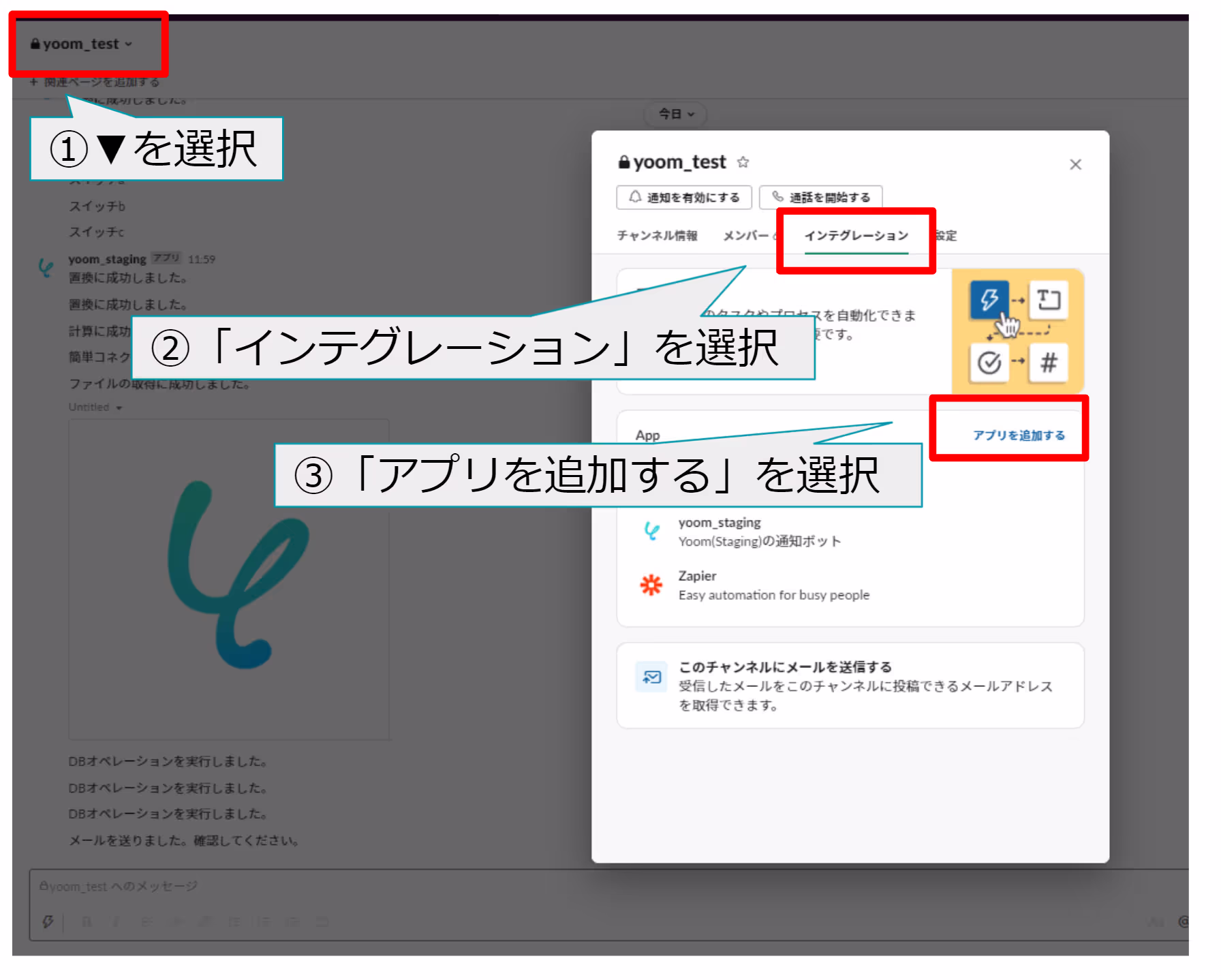 投稿したいチャンネルにYoomアプリを追加する必要があります。Slackサービス上で、Yoomからメッセージを送信するSlackチャンネルを開き、下記の図のとおり、①〜③に順に設定を行います。