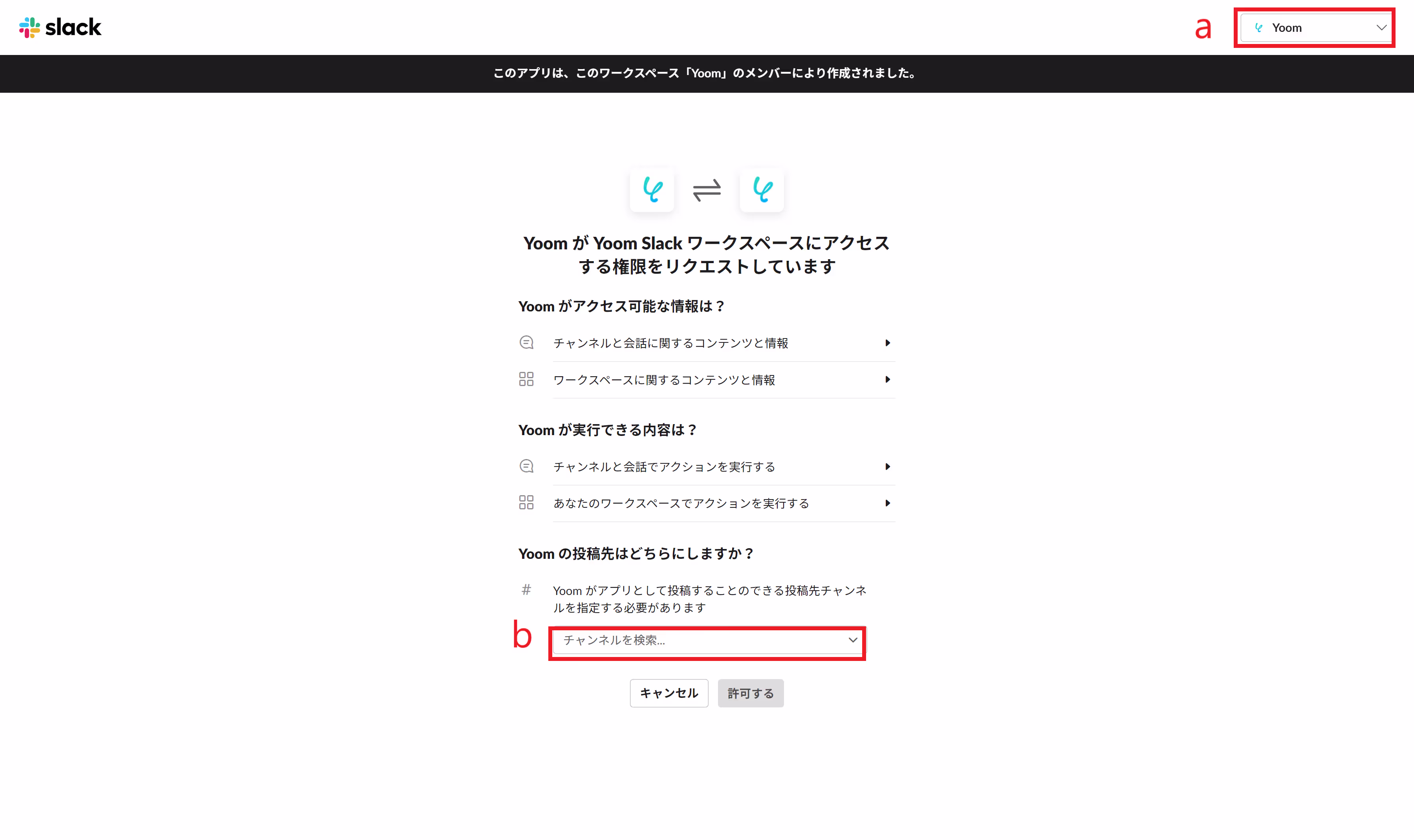 YoomとSlackとの連携を行います。下記設定を行った後、「許可する」ボタンをクリックします。