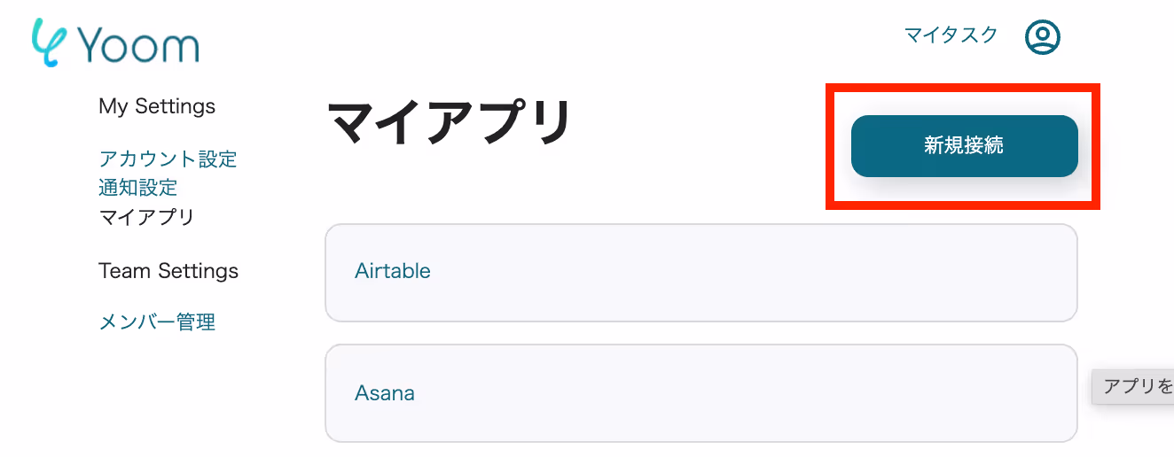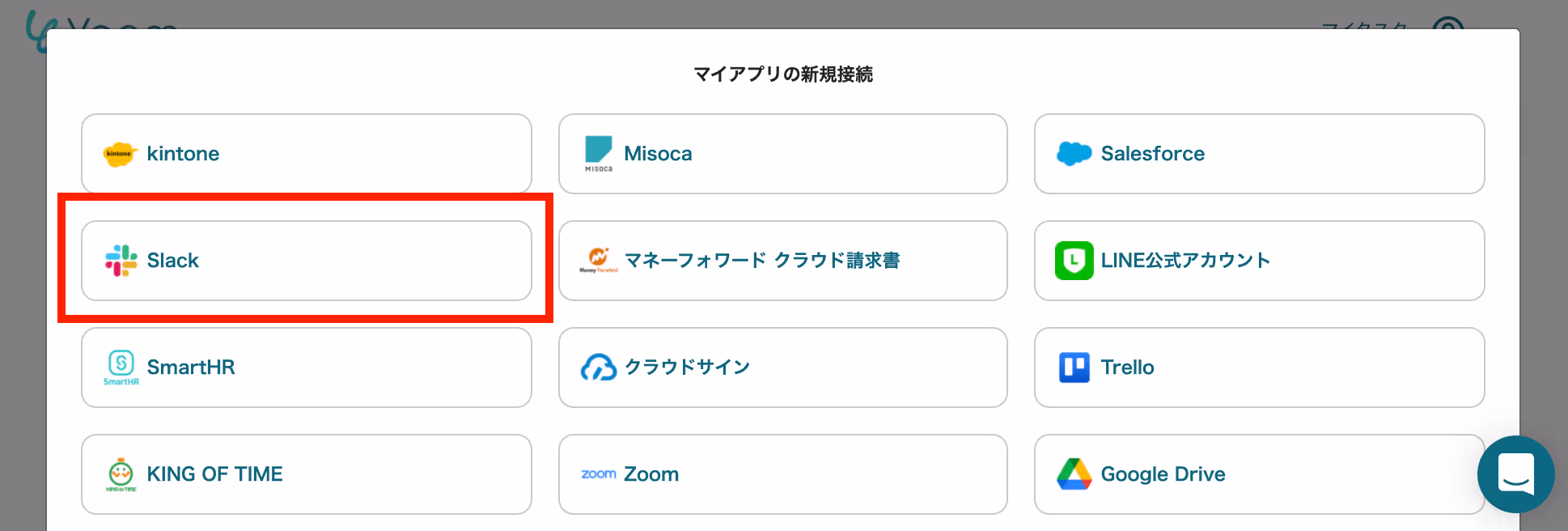 Yoomにログインし、左タブからマイアプリページを選択、「新規接続」ボタンをクリックし「Slack」を選択します。