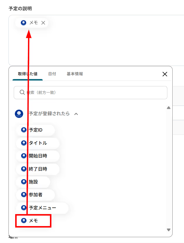 (4)「予定の説明」にも、取得した値を活用できます。