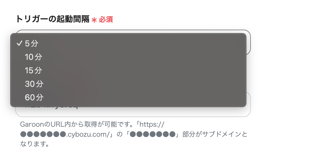 トリガーの起動間隔はプルダウンより5分、10分、15分、30分、60分の間隔から選択してください。