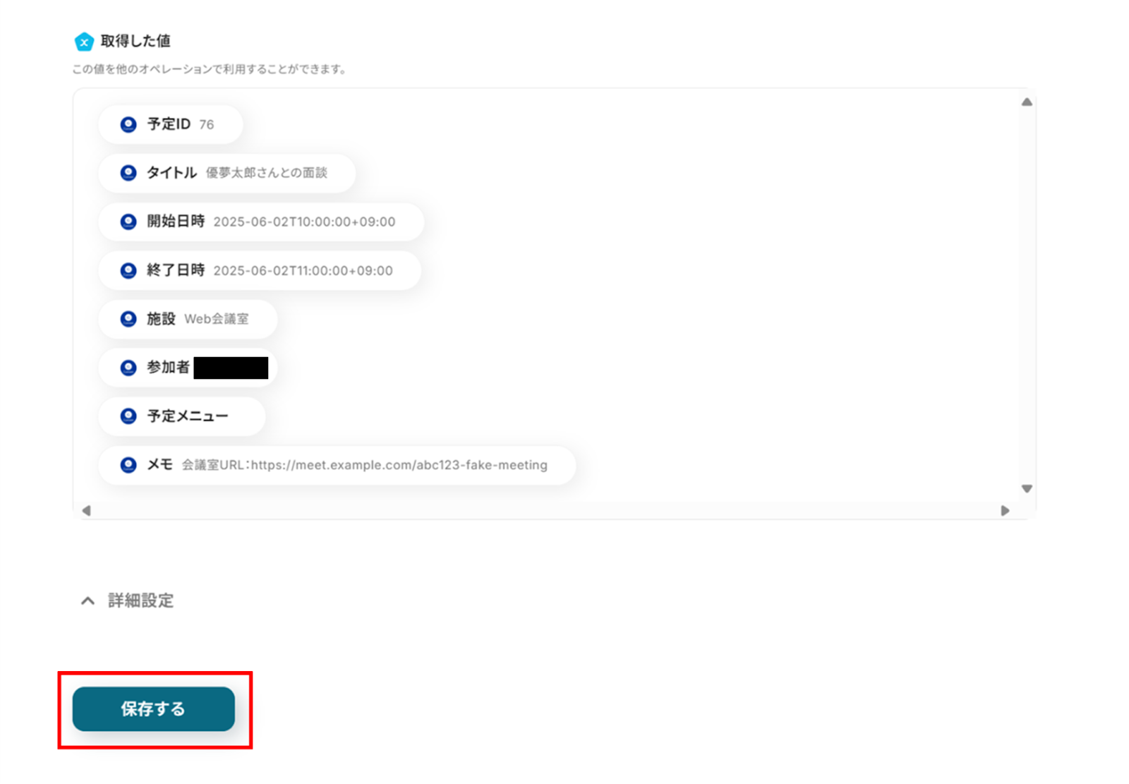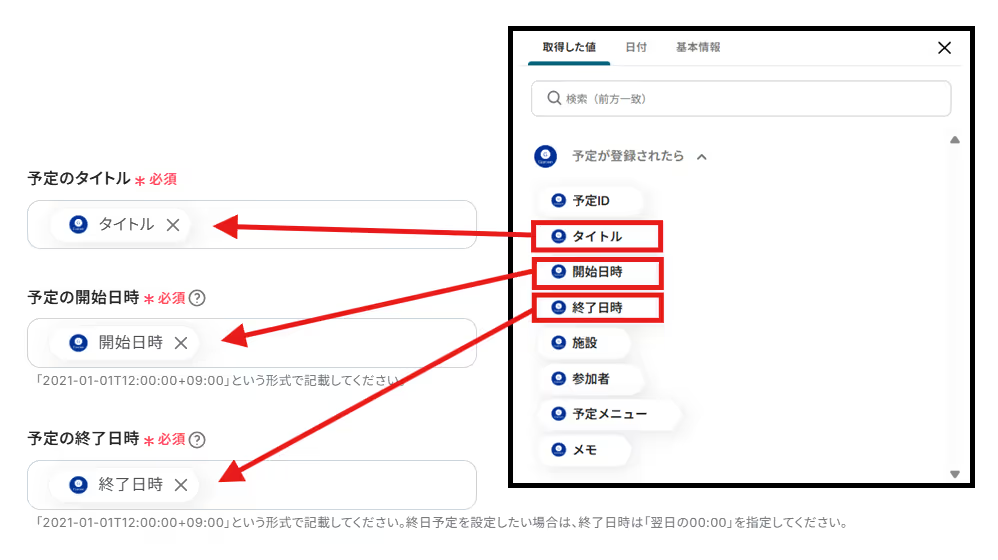 (以下は「予定の開始日時」などの項目に前ステップで取得した値を引用したものです。)
