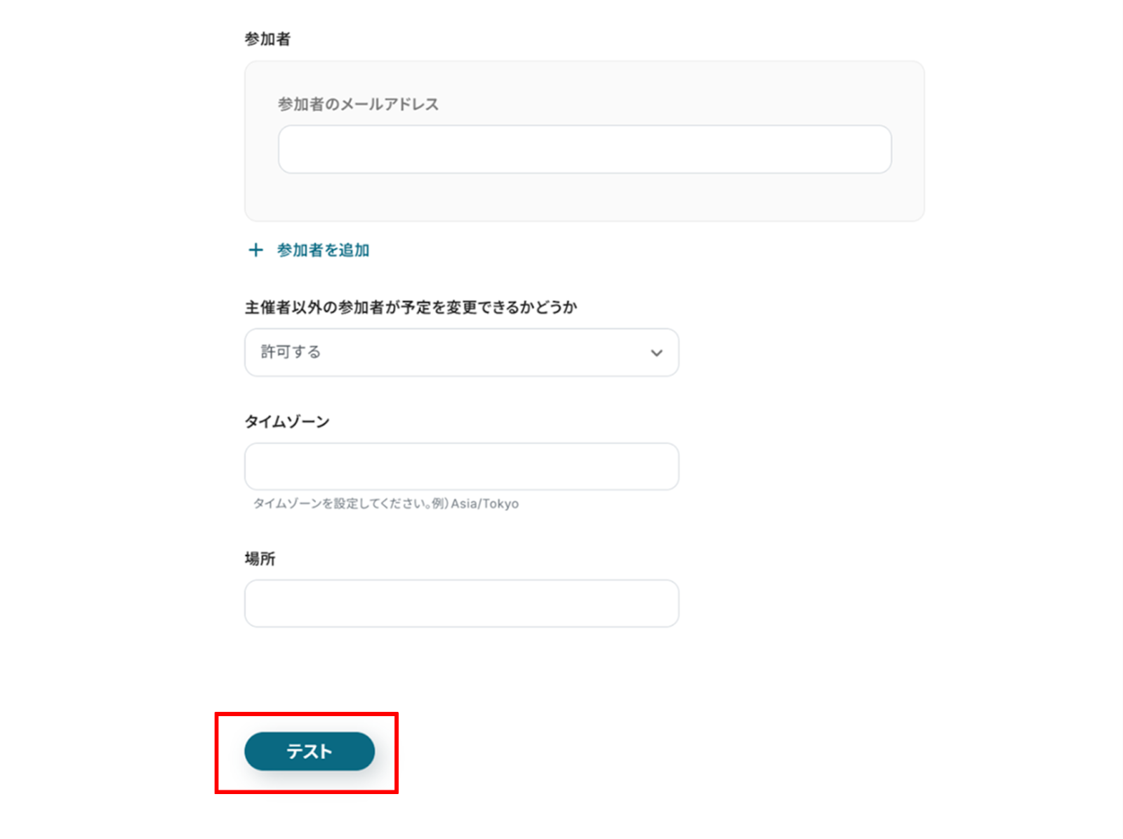 (6)その他任意で入力し、完了したら「テスト」をクリックします。