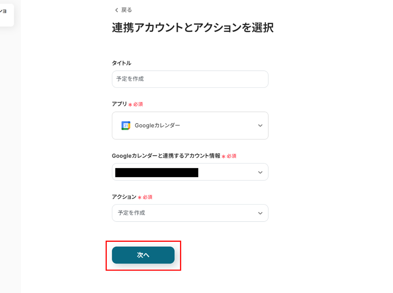 (2)Googleカレンダーの「連携アカウントとアクションを選択」画面から、Googleカレンダーと連携するアカウント情報に誤りがないかを確認し、アクションは「予定を作成」のままで「次へ」をクリックします。