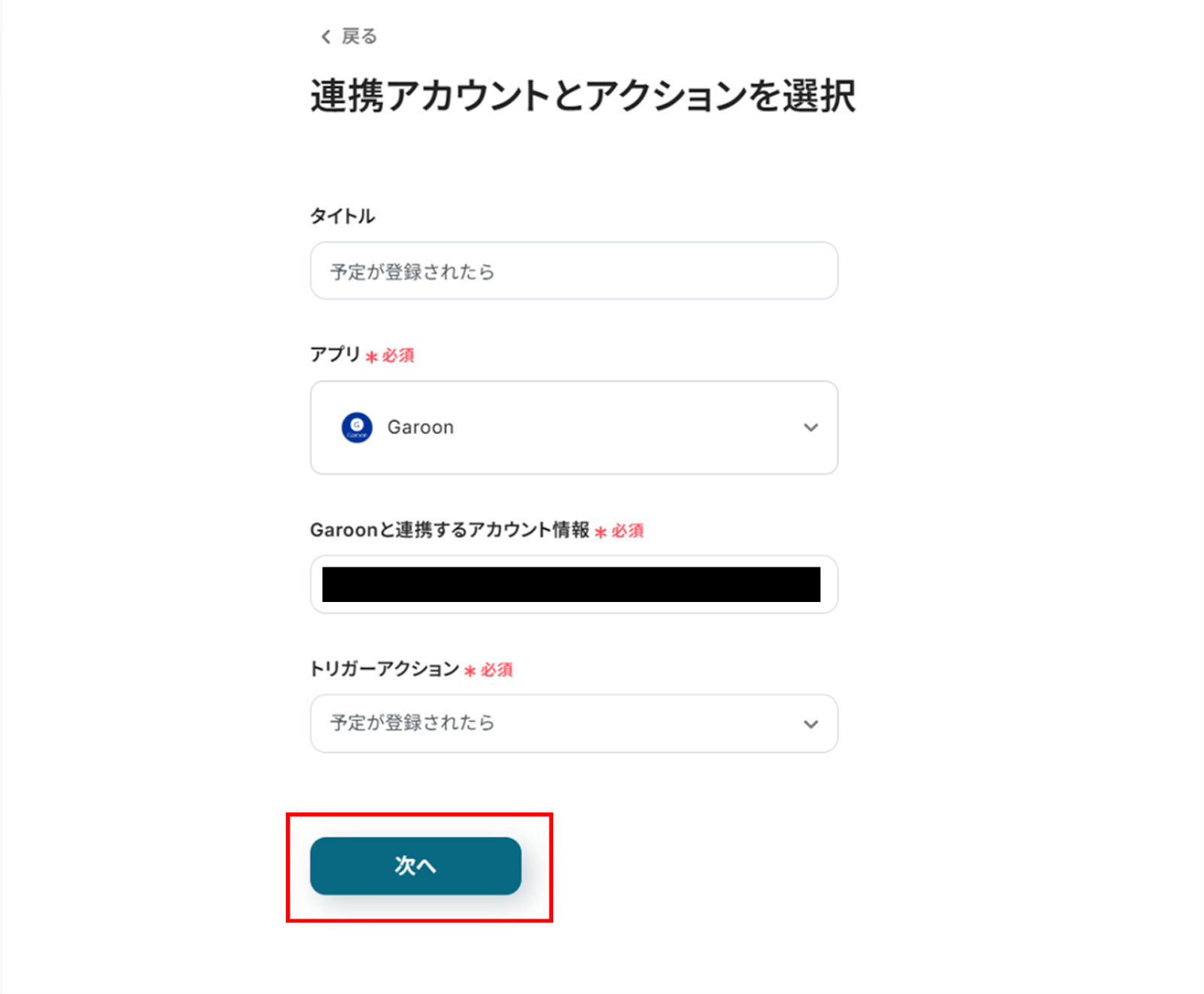 (2)Garoonの「連携アカウントとアクションを選択」画面から、Garoonと連携するアカウント情報に誤りがないかを確認し、トリガーアクションは「予定が登録されたら」のままで「次へ」をクリックします。