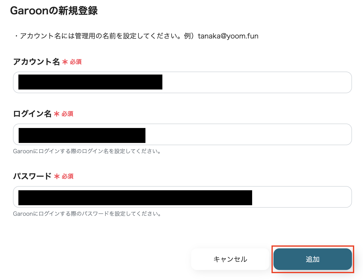 (2)「Garoonの新規登録」画面から、お持ちのアカウント名、ログイン名、パスワードを入力し、「追加」をクリックします。