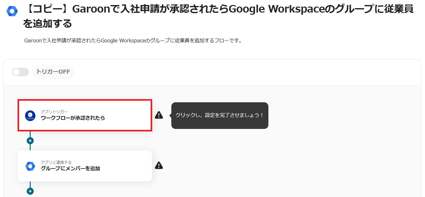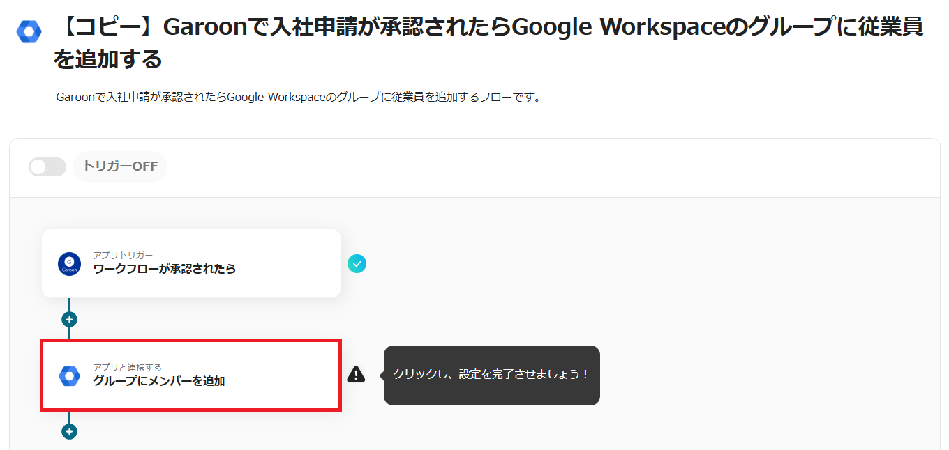 5.トリガーをONにすると、Garoonで入社申請が承認されるたびにGoogle Workspaceのグループに従業員が自動で追加されます。