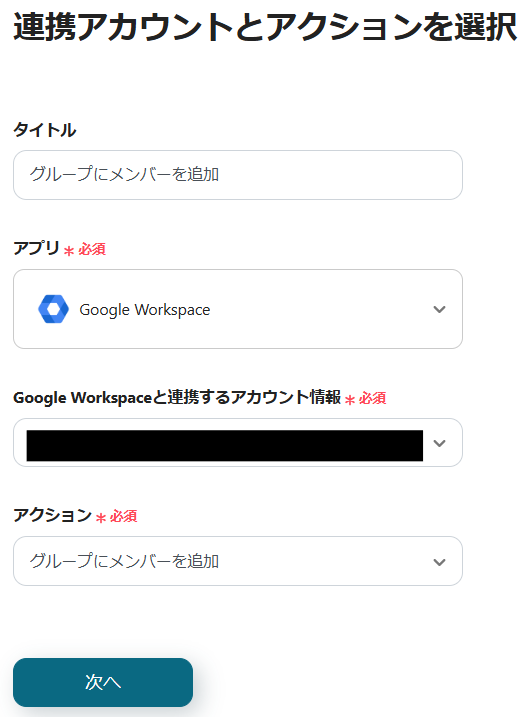2.Google Workspaceと連携するアカウントを確認し、「次へ」をクリックします。