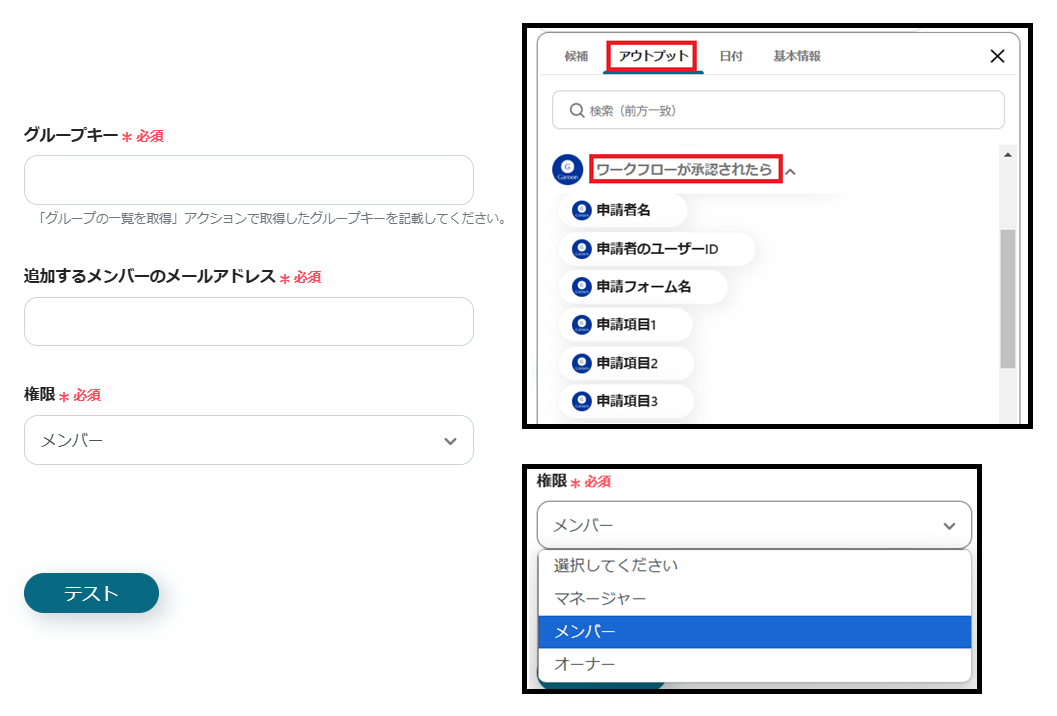 ※グループキー、追加するメンバーのメールアドレスは、枠をクリックして表示されるアウトプットの「ワークフローが承認されたら」から選択します。(値は二重括弧で表示されます)