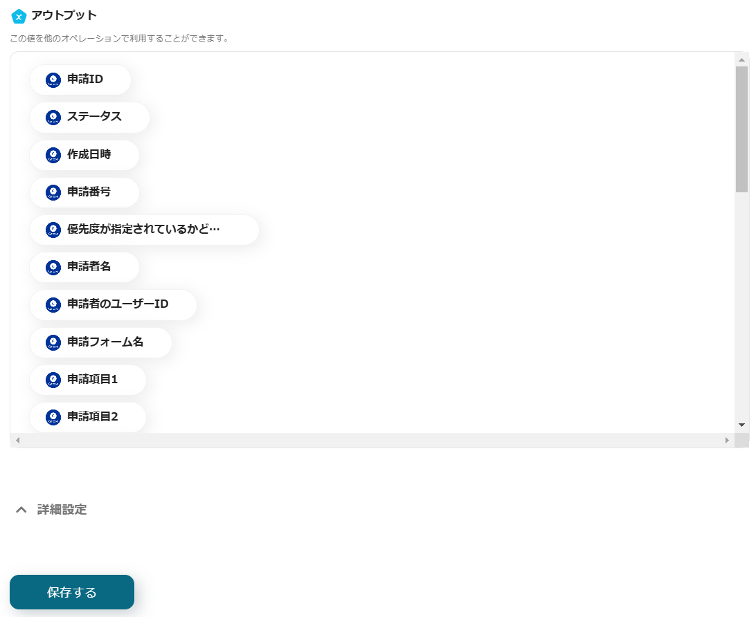 アウトプットの「申請項目1」「申請項目2」などの項目を任意の名称へ変更し、保存します。