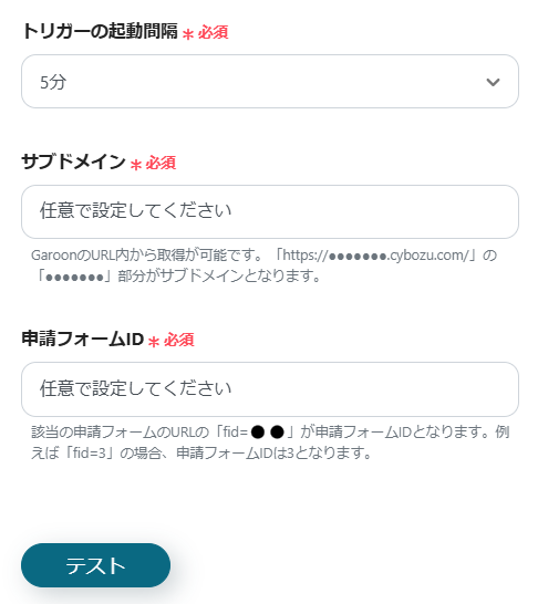 4.トリガーの起動間隔、サブドメイン、申請フォームIDを設定し、テストを行います。