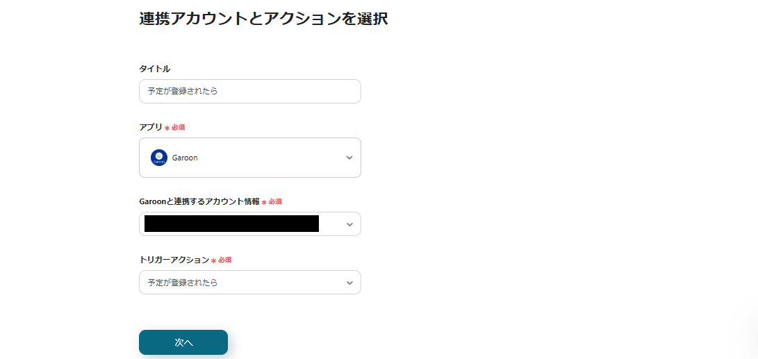 まずは、アプリトリガーの「予定が登録されたら」という項目を設定しましょう。