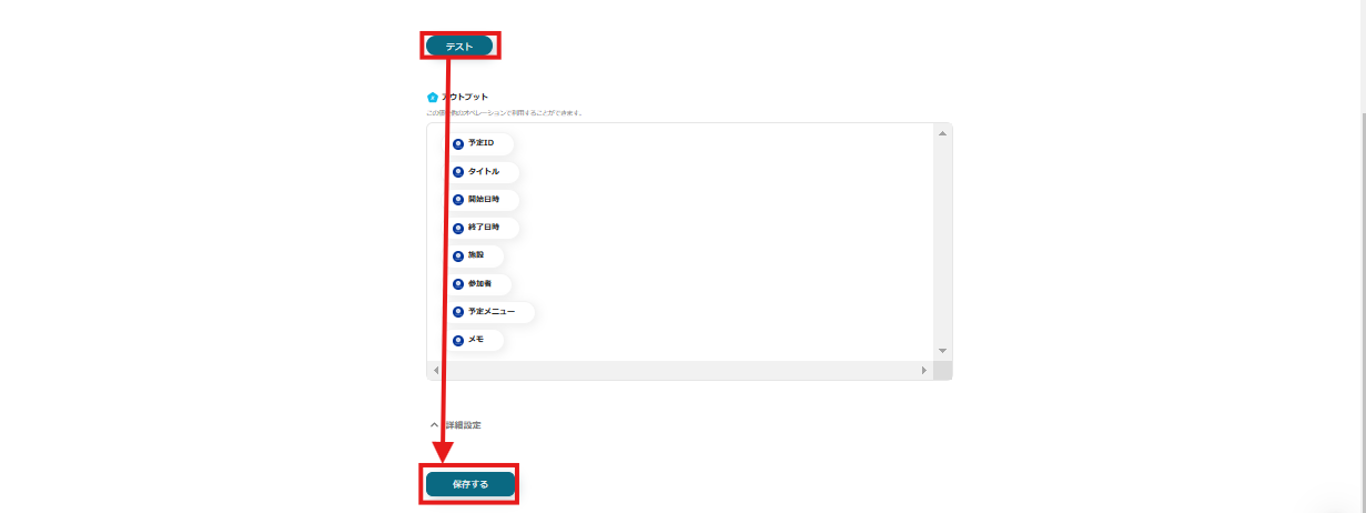 先ほど登録したGaroonのカレンダー情報がアウトプットに表示されます。