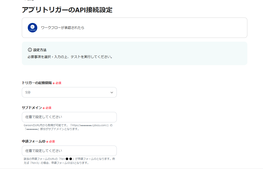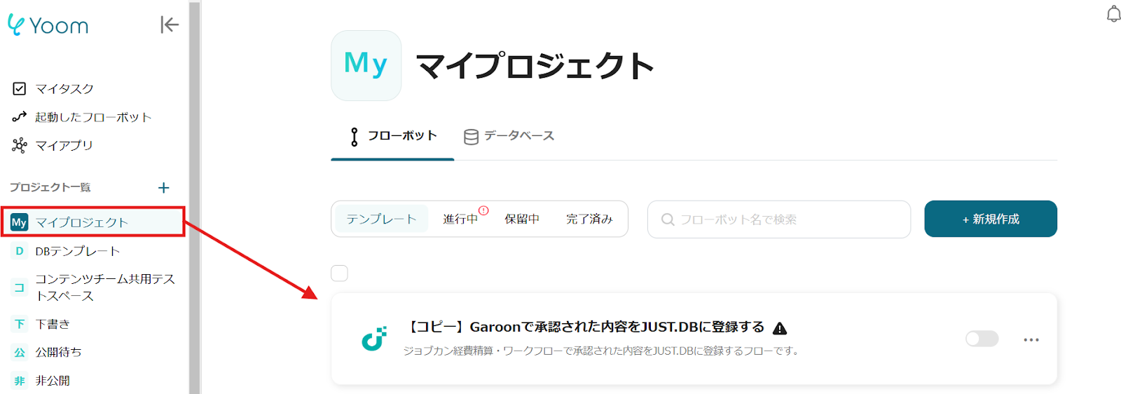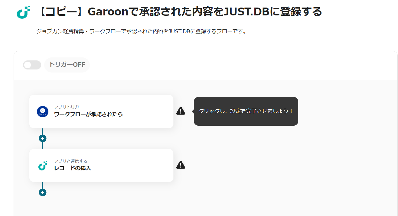 ここからは、Yoomのテンプレート【Garoonで承認された内容をJUST.DBに登録する】という連携フローを使って設定をしていきます。