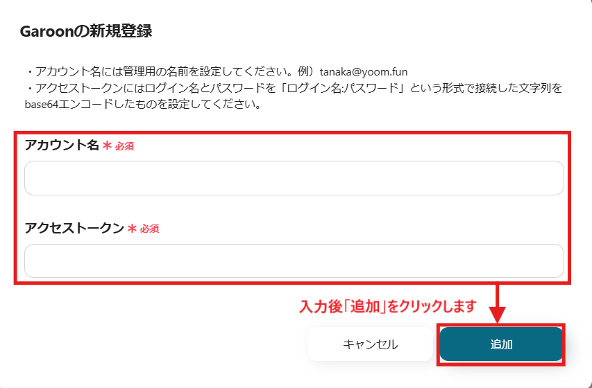 Garoonを選択できたら、アカウント名と事前準備で作成したアクセストークンを入力し、追加をクリックしてください。