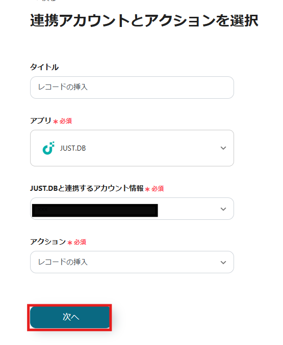 2) アクションは「レコードの挿入」を選択し、「次へ」をクリックします。