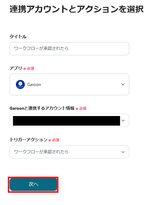 1) アクションは「ワークフローが承認されたら」を選択して、「次へ」をクリックします。