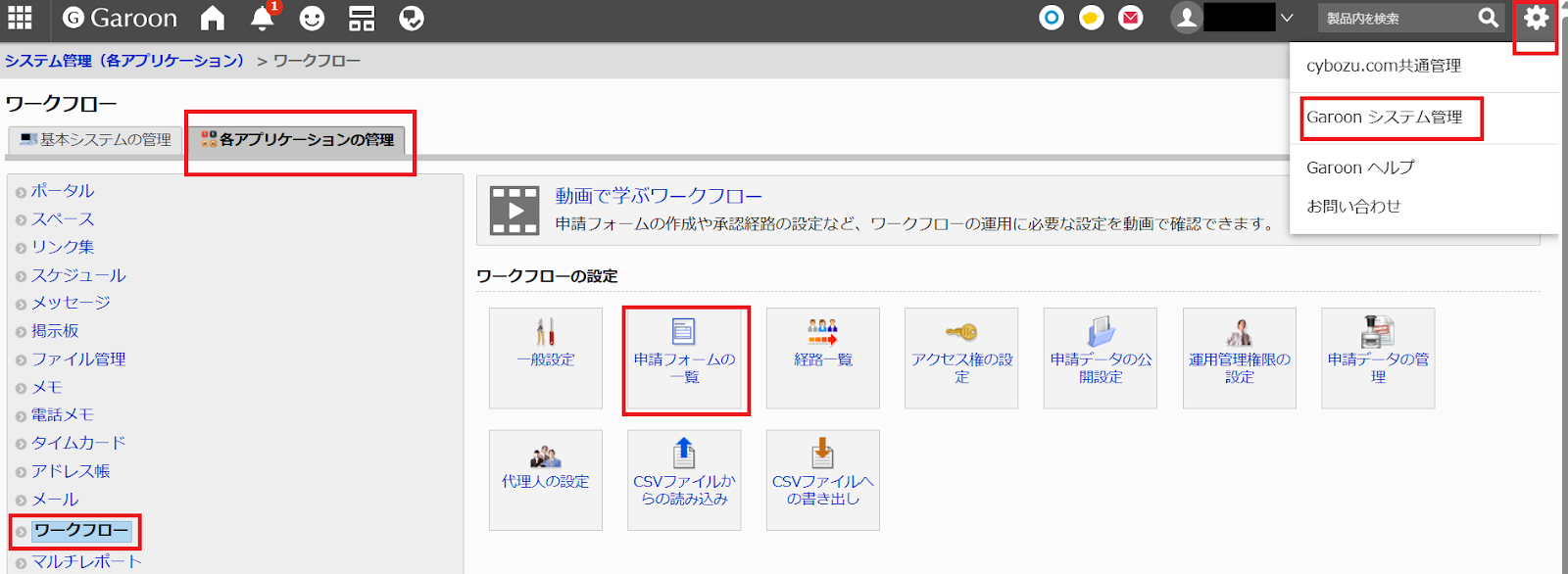 ログイン名はGaroon右上歯車マークを選択し、cybozu.com共通管理から確認できます。