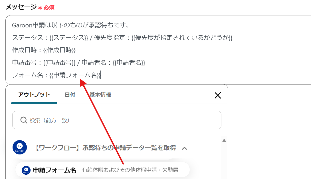 アウトプットにGaroonの承認待ち申請内容が反映したら保存します。