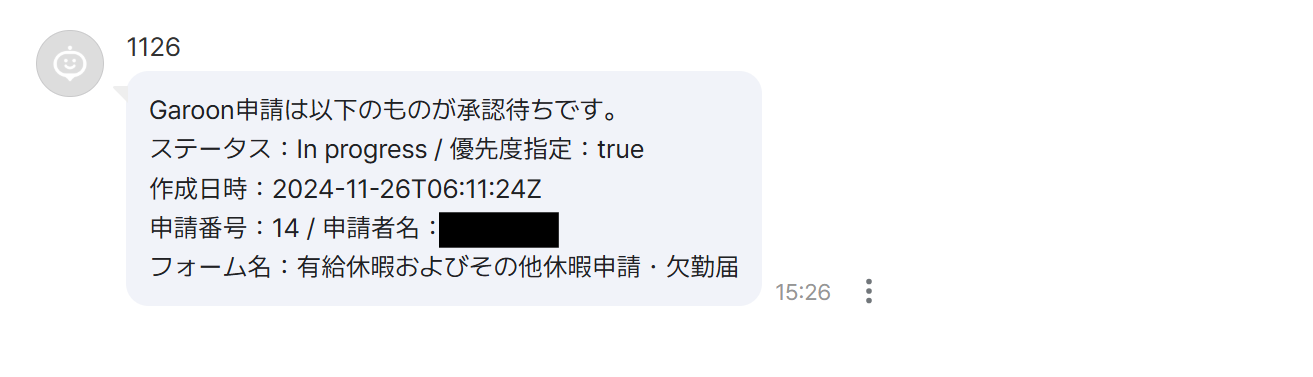 しかし、この自動化により、毎日Garoonで承認待ちの申請データが取得され、LINE WORKSに自動で通知が届くため、担当者は通知だけで申請状況を把握できます。