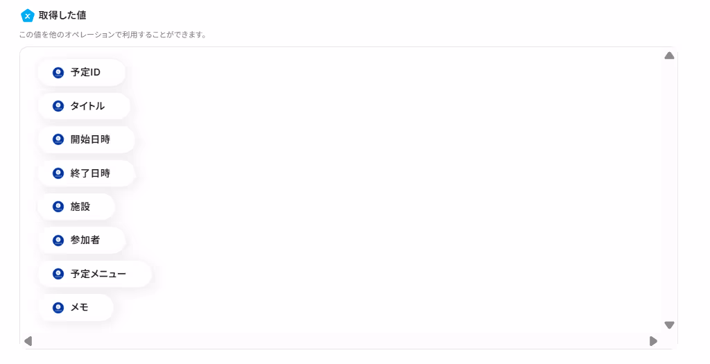 テストが成功した場合は、アウトプット(取得した値)を取得できます。実際の設定では、各項目に具体的な値が反映されます。