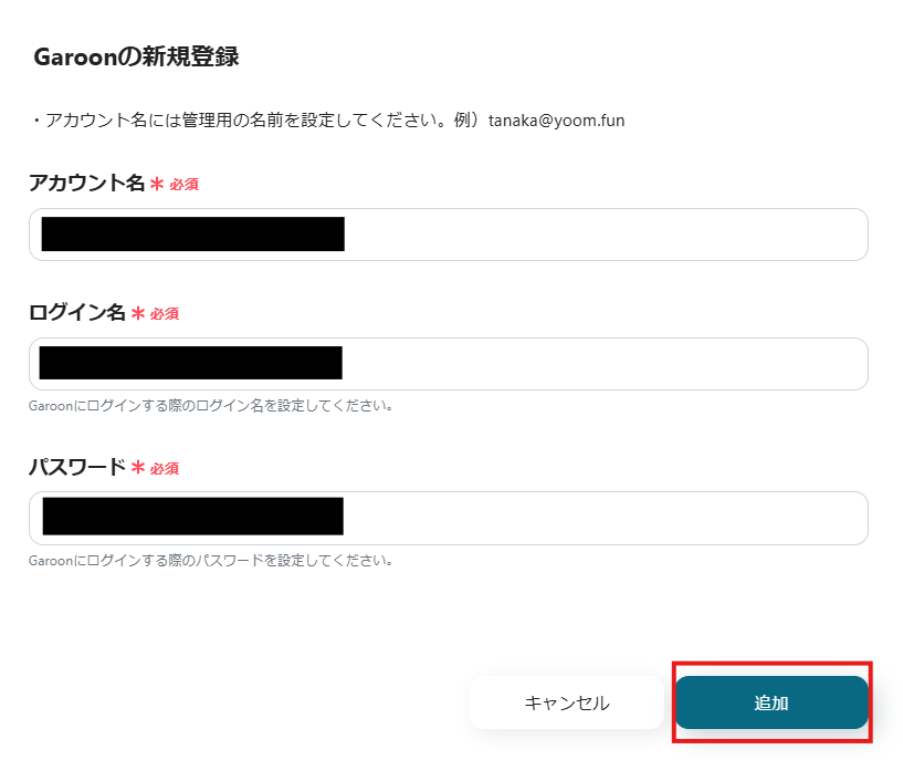 2.表示された画面で、必須項目を入力し、「追加」をクリックしてください。